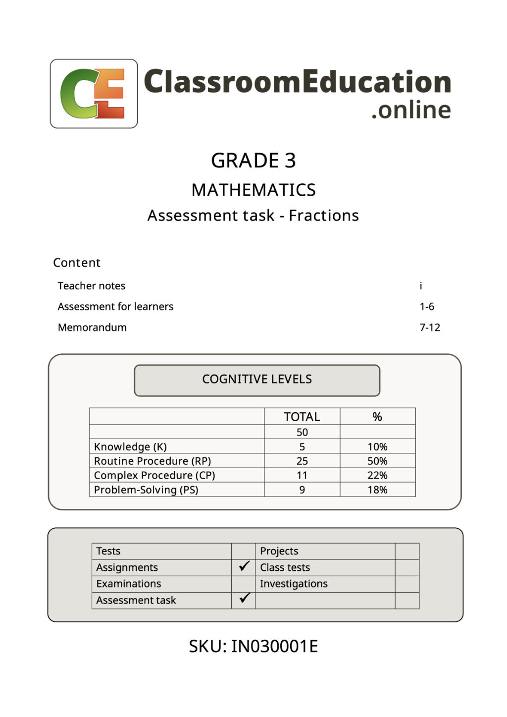This assessment contains comprehensive questions on the topic of fractions and can be used as a worksheet or assessment task. According to both CAPS and the ATP, fractions are done in every term, however, we suggest that you use this in either the third or fourth term.
