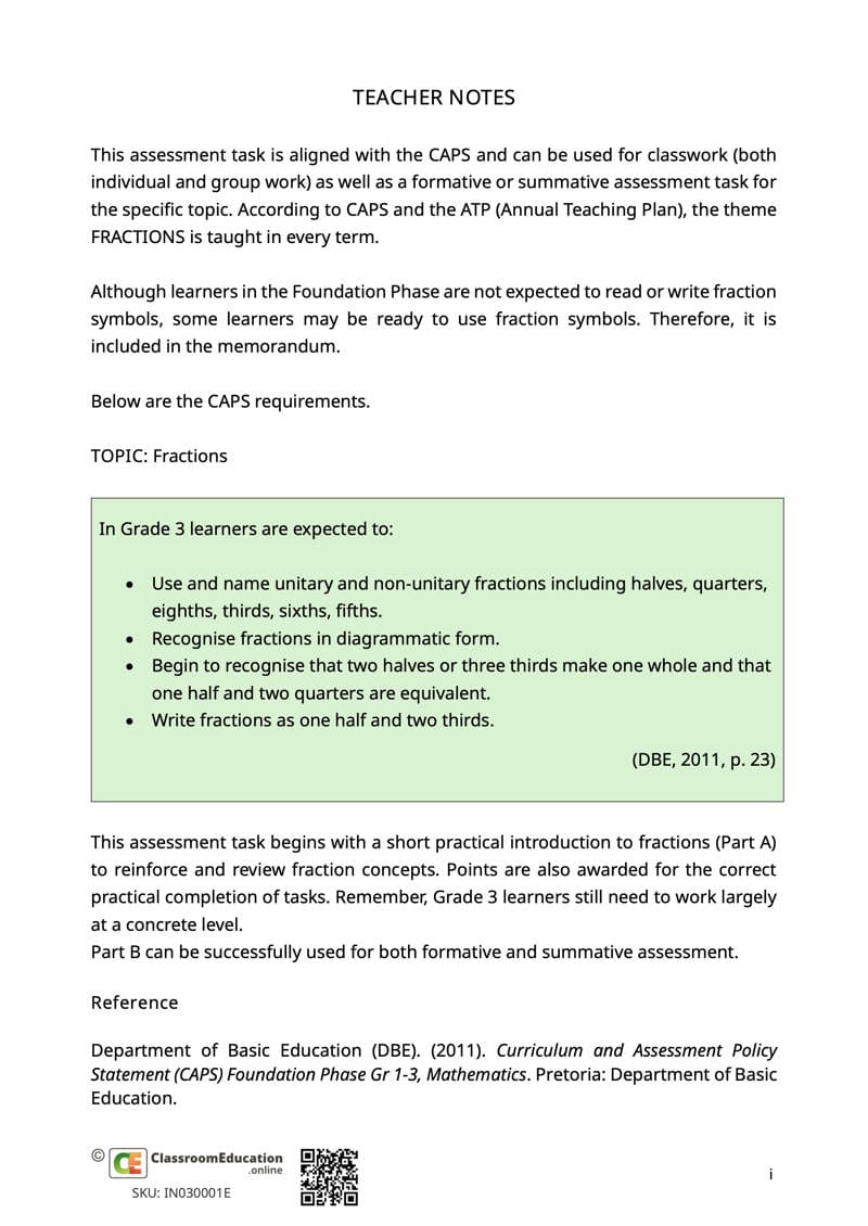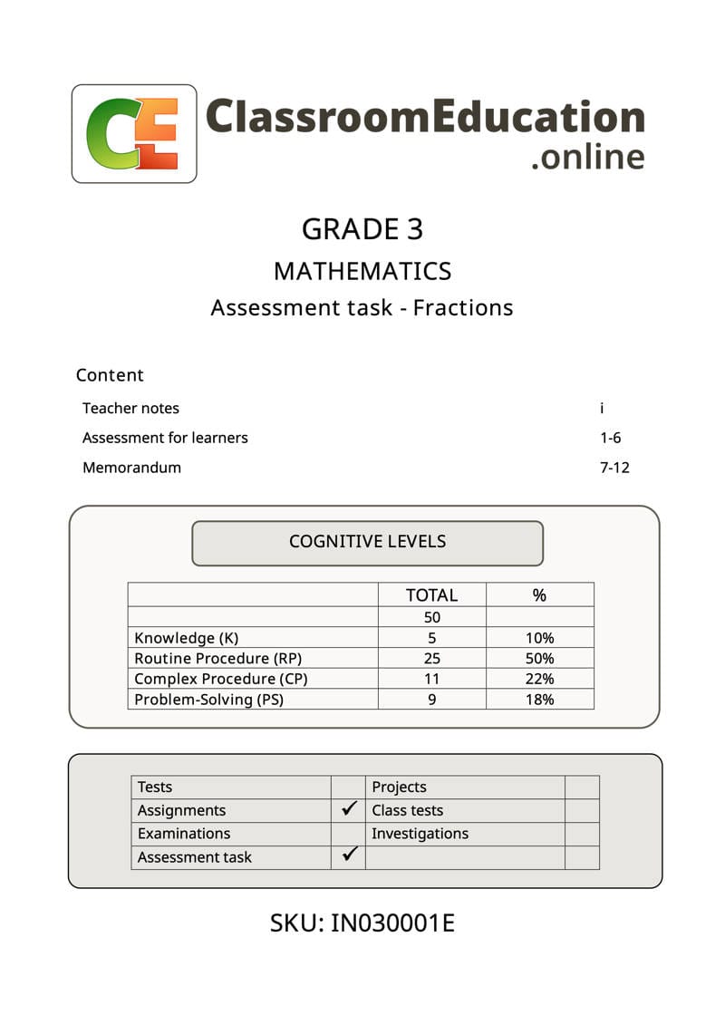 This assessment for Grade 3, Mathematics, contains comprehensive questions on the topic of fractions and can be used as a worksheet or assessment task. According to both CAPS and the ATP, fractions are done in every term, however, we suggest that you use this in either the third or fourth term.