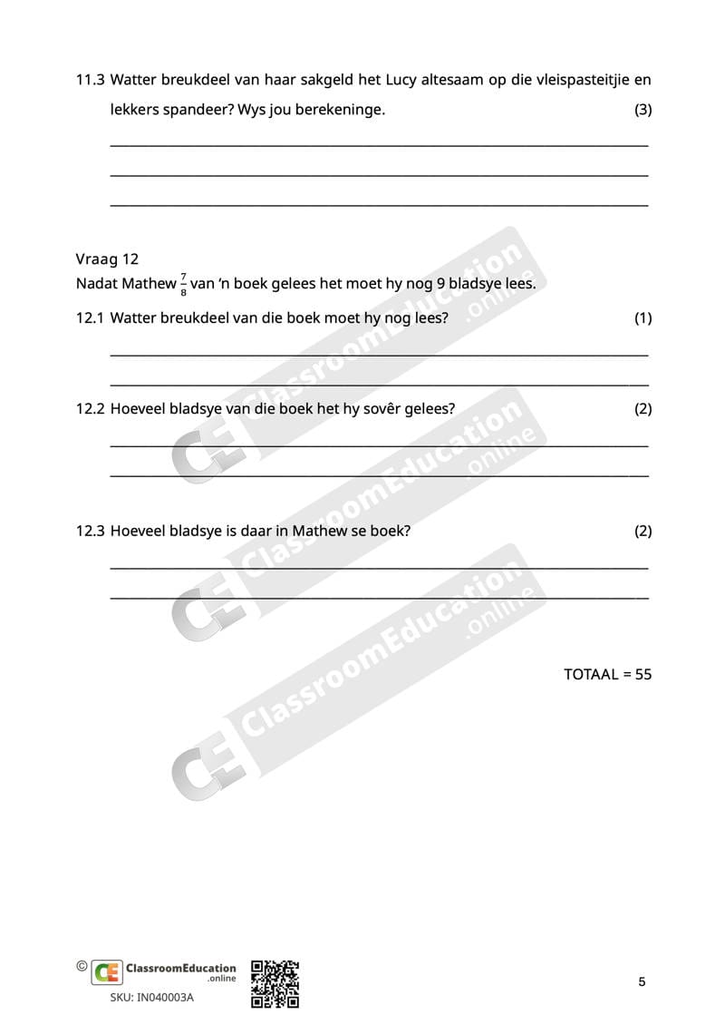 Hierdie assessering vir Graad 4, Wiskunde, bestaan uit omvattende vrae rakende breuke en kan as ‘n klastoets of ‘n werksopdrag gebruik word. Volgens die CAPS word hierdie in kwartaal 2 gedoen. Volgens die ATP, word hierdie in kwartaal 3 gedoen.