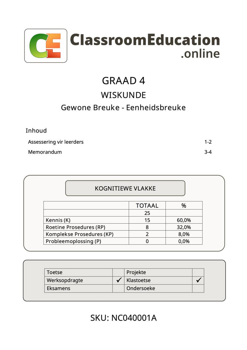 Hierdie assessering vir Graad 4, Wiskunde, fokus op die basiese kennis van breuke, naamlik eenheidsbreuke en kan as ‘n klastoets of ‘n werksopdrag gebruik word. Volgens die CAPS word hierdie in kwartaal 2 gedoen. Volgens die ATP, word hierdie in kwartaal 3 gedoen.