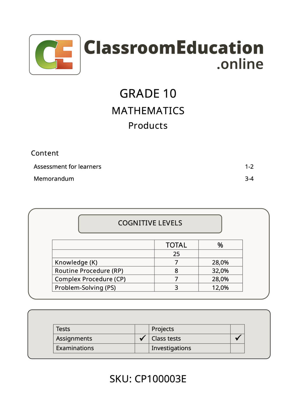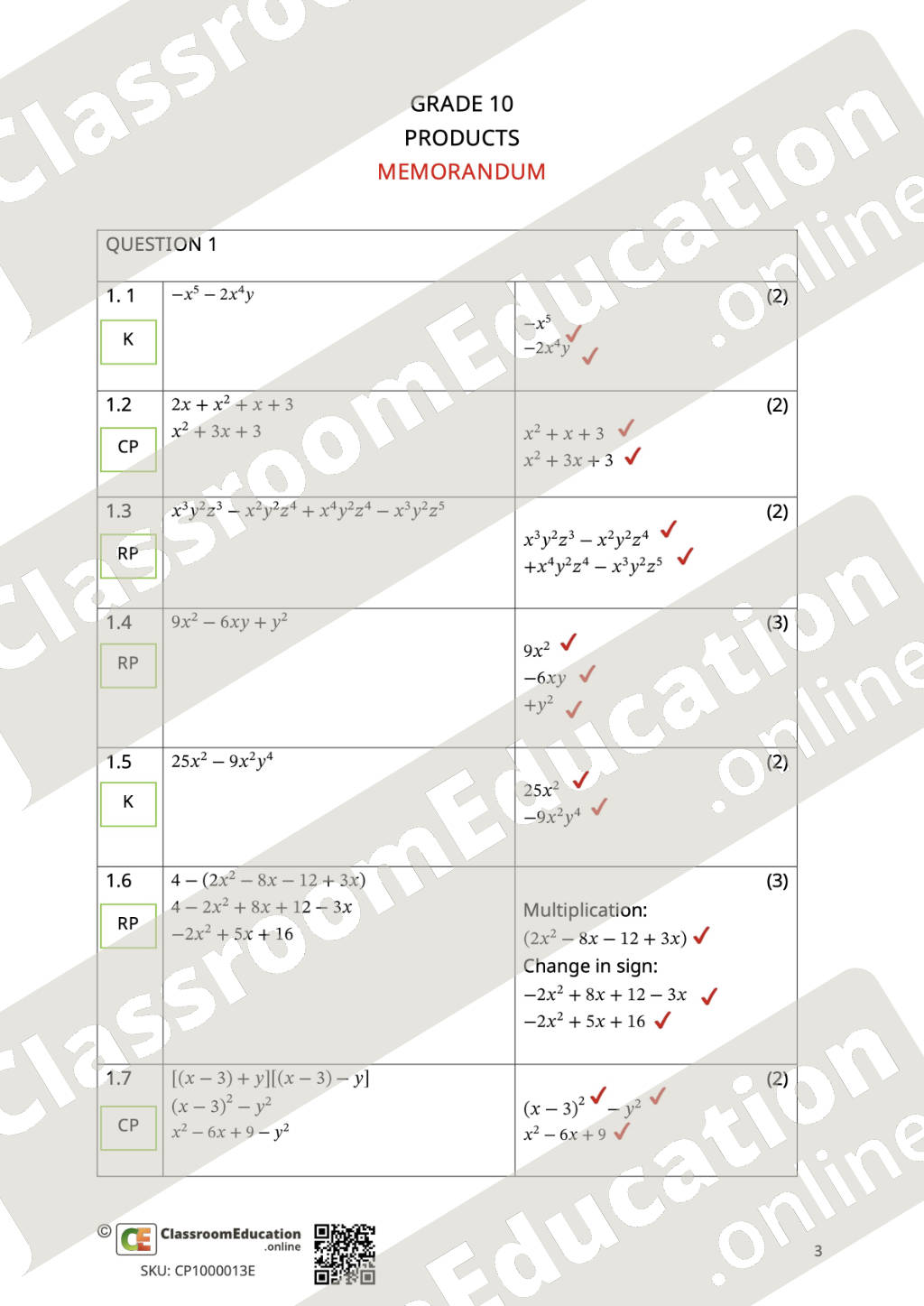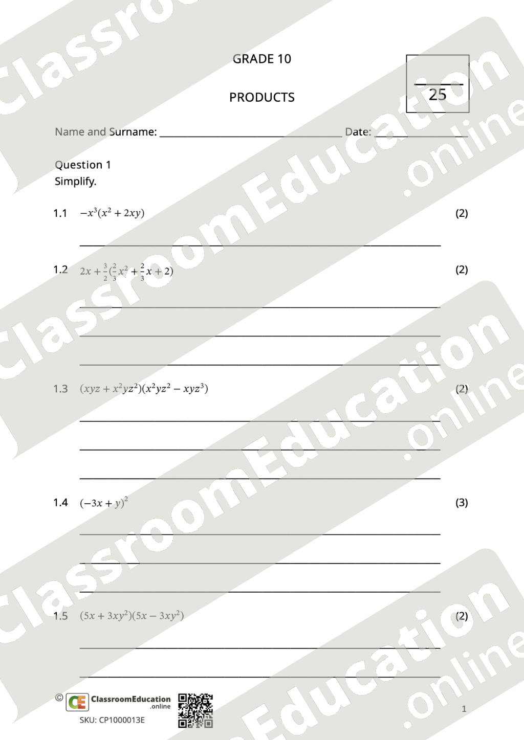 This assessment focuses on the basic knowledge and application of products – the multiplication of terms – and can be used as a class test or an assignment. According to both CAPS and the ATP, this should be done in term 1.