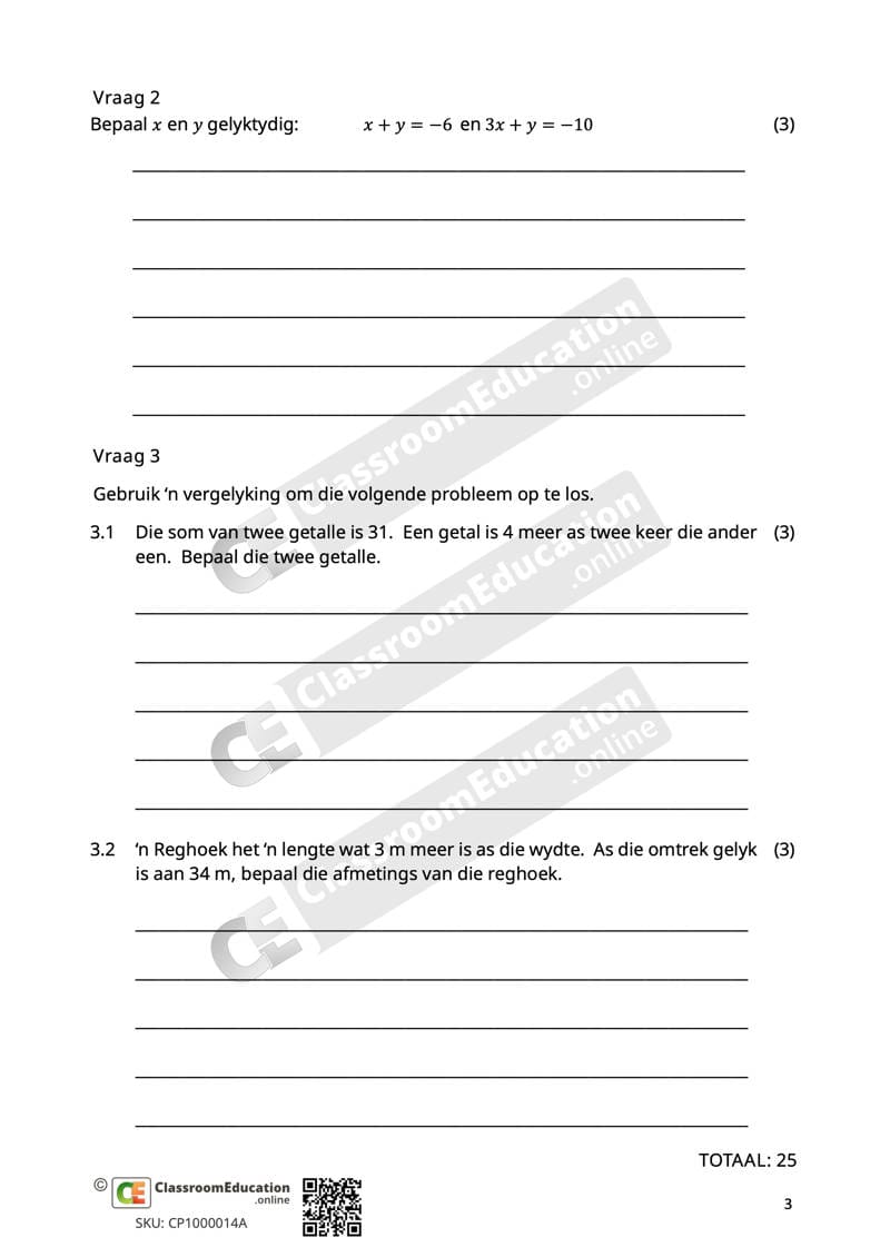 Hierdie assessering vir Graad 10, Wiskunde, fokus op die basiese kennis en toepassing van vergelykings asook woordsomme en kan as ‘n klastoets of ‘n werksopdrag gebruik word. Volgens beide die CAPS en ATP word hierdie in kwartaal 1 gedoen.